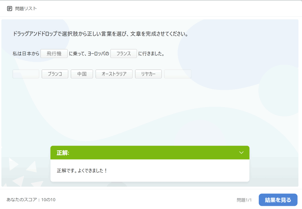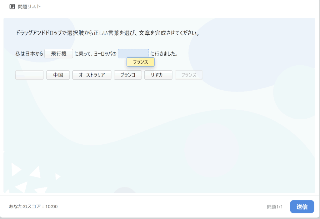 選択肢のワードをマウスでヒョイっとドラッグして問題文の空欄にドロップさせるものです。