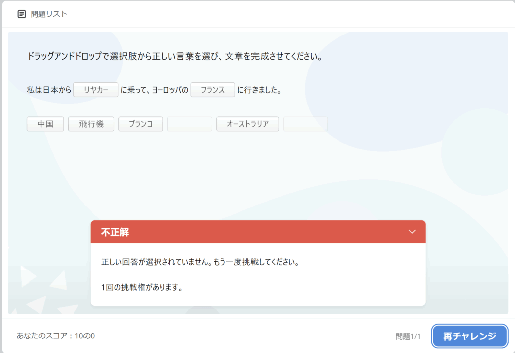 そして、選択肢が正しくない場合は、不正解(赤信号)でちゃんとフィードバック表示。