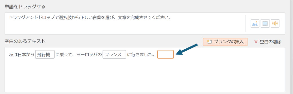 空欄を埋めてほしい文章を[空白のテキスト]エリアに入力し、[ブランクの挿入]ボタンをクリックするとブランクができます(スクリーンショットでは、テキスト文の最後にブランクを挿入しております)。ブランクを作ったらその中に正解のワードを入力します。