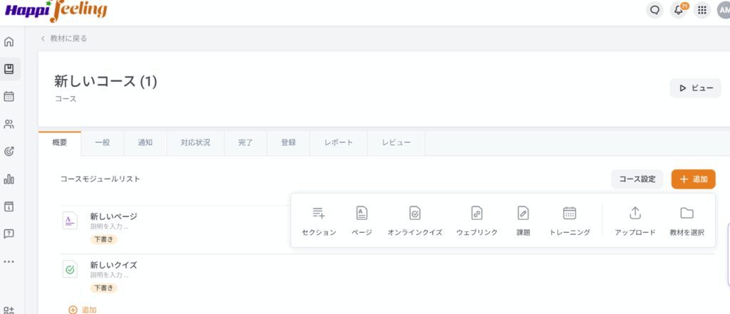 上図(iSpring Learn画面):LMS内でなんとコースが作れてしまいます。つまりコンテンツ制作ツールなしでもOKなのです。コース内にはページ、クイズなど追加可能です。クイズ形式は全6種類!(択一選択、複数選択、入力問題、シーケンス、マッチング、画像を用いたカードの並べ替え)。