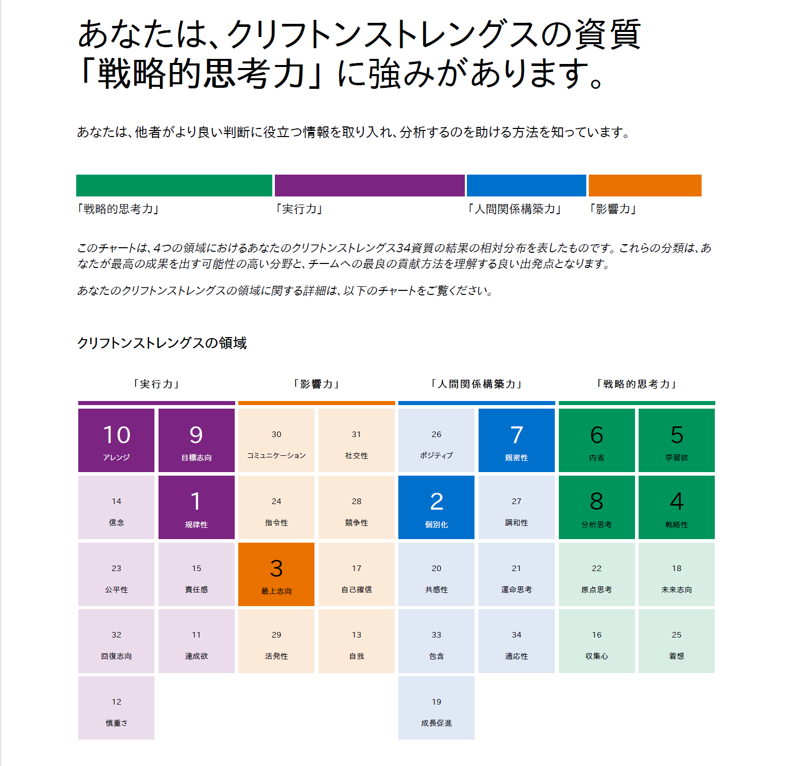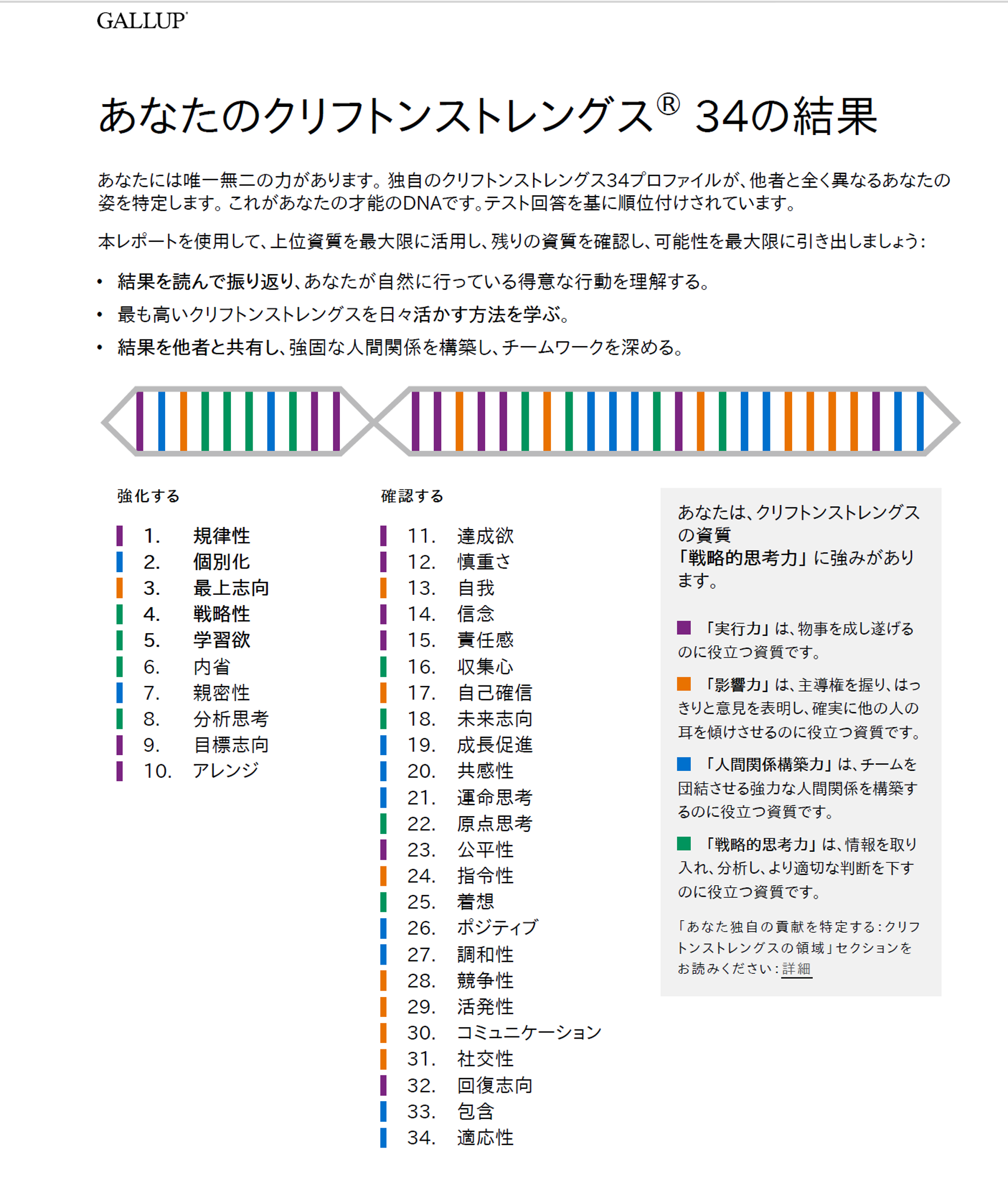 34の資質は1位から34位まで順位付けます。そのうち上位5位までは組み合わせによって資質の内容はパーソナライズされます。