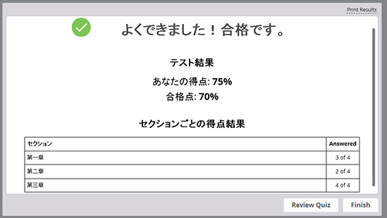 Spring QuizMaker製品は、14種類のクイズテンプレートが用意されています。分岐機能を使って受講者の解答に応じて解説ページを挟んだり、出題する問題をシャッフルしたりする機能があり、便利です。ユーザーのクイズ結果を指定されたインストラクタやユーザーに送信する機能もあり、クイズの運用を助ける機能が盛りだくさんです。