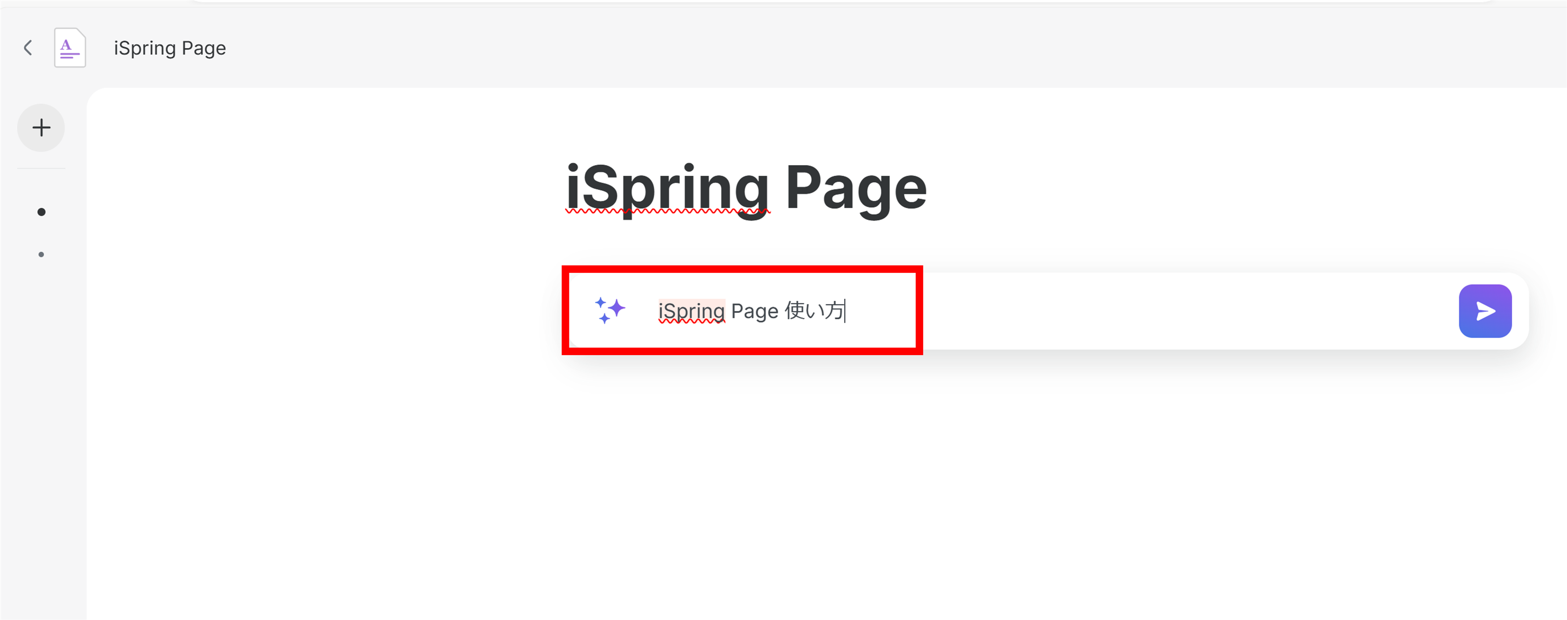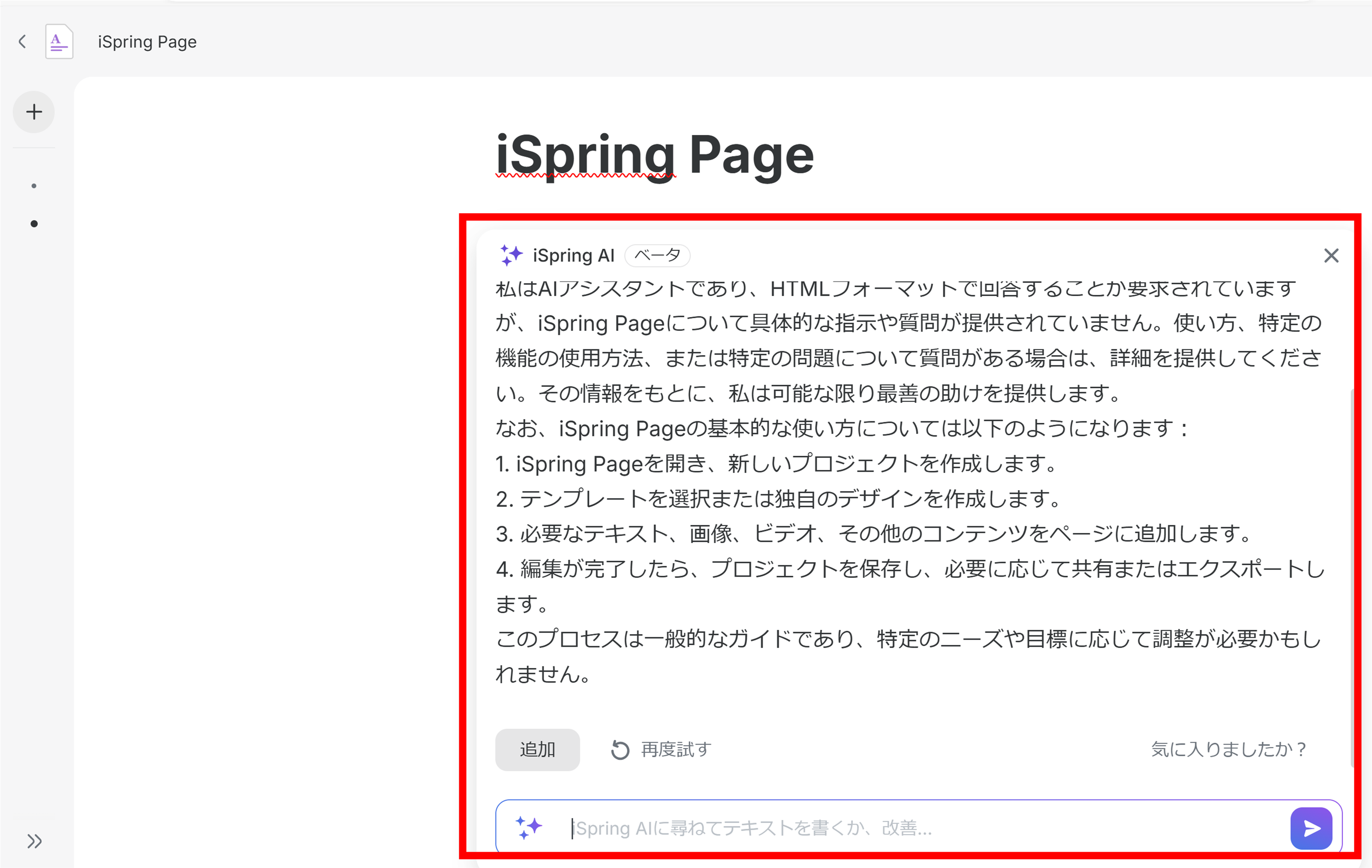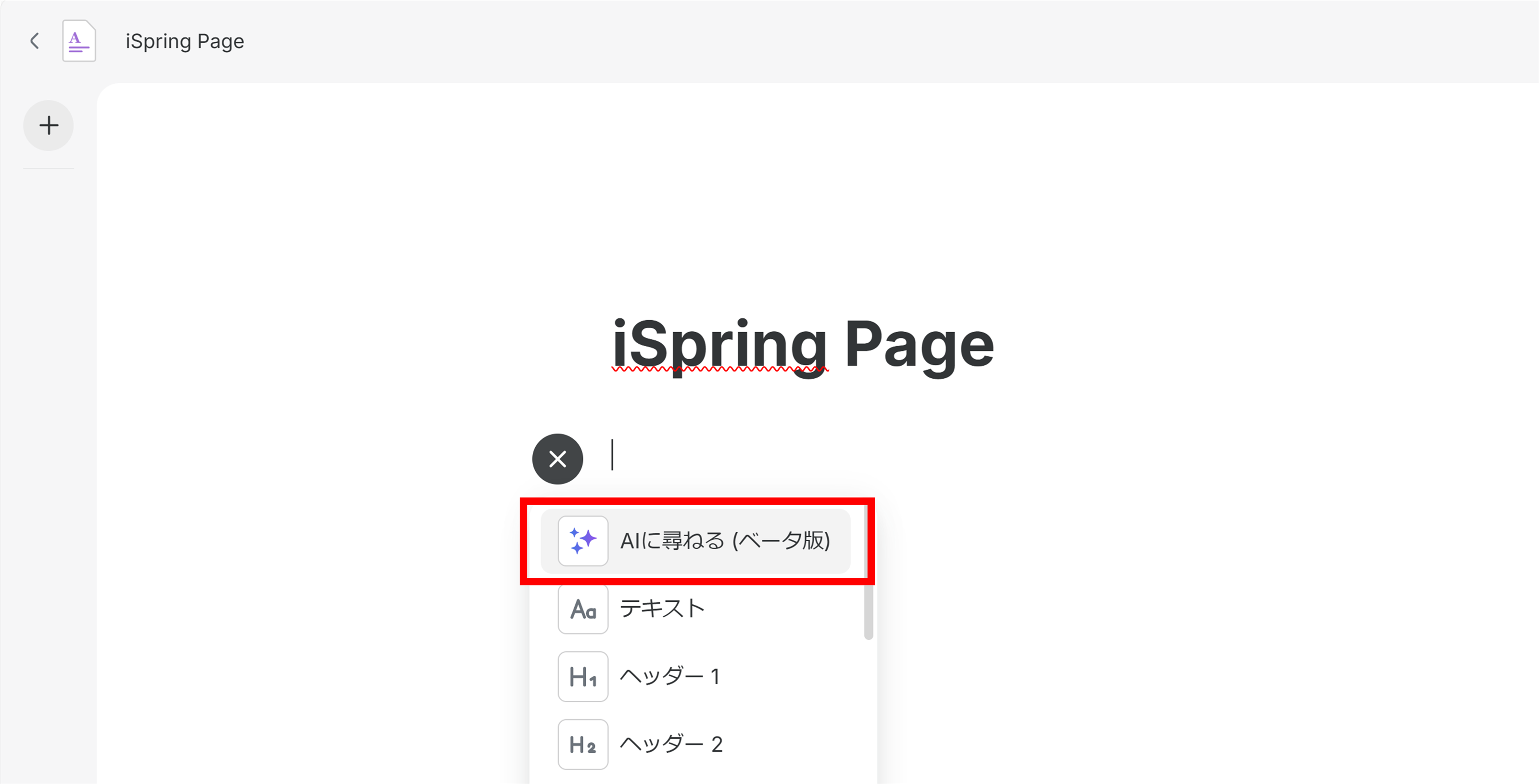 ①iSpring Pageから新しいページを作成する際、AIを使うことが可能です。ドロップダウンから[AIに尋ねる]を選択します。