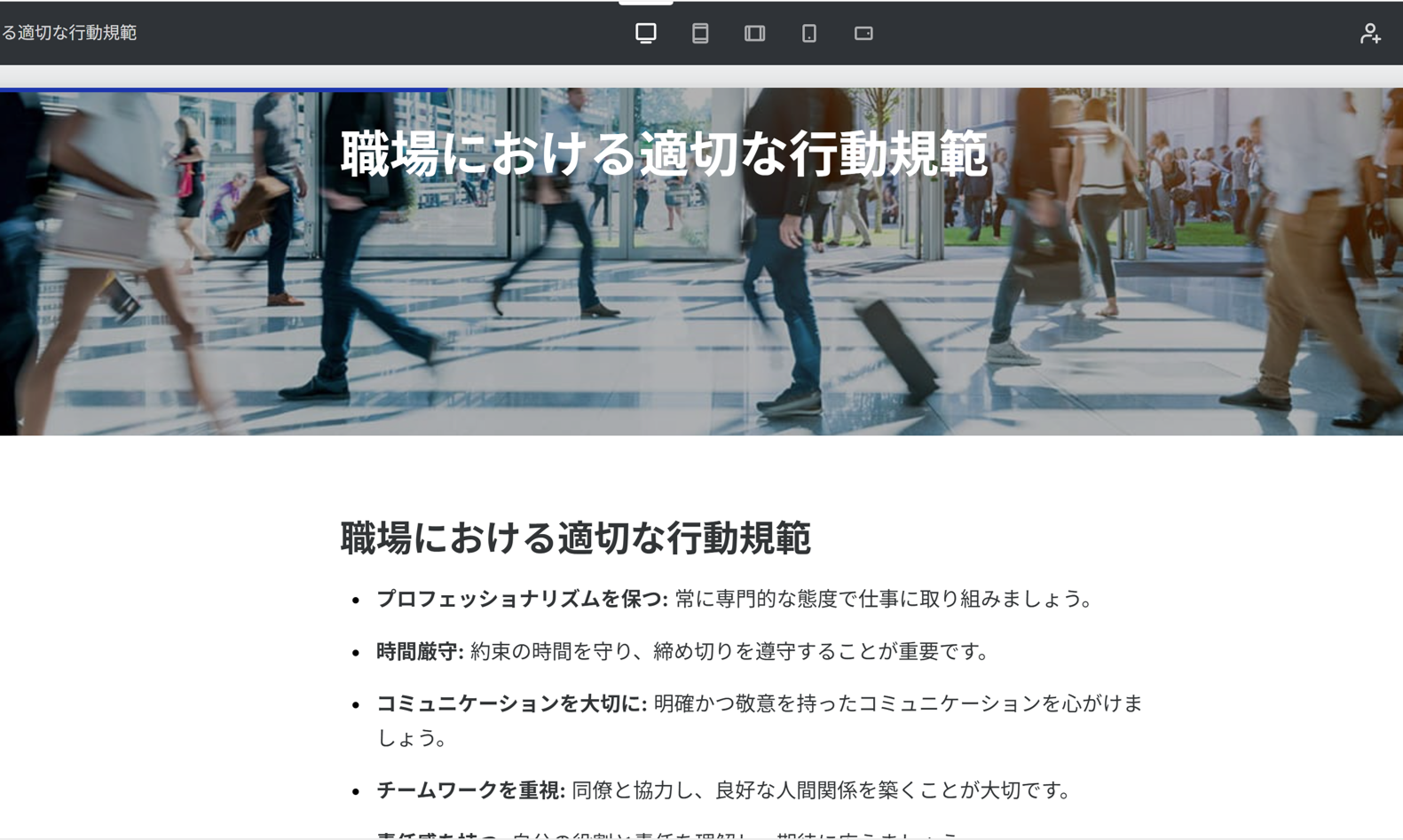⑥コンテンツが出来たら、プレビュー画面で確認できます。PC画面、タブレット、スマホでの見栄えもすぐに確認することができます。