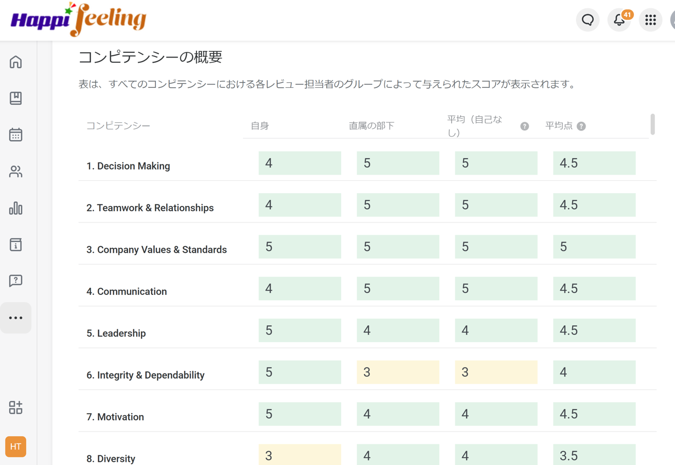 従業員に自身の他、上司、同僚、部下等にコンピテンシーのアンケートを送信し、同じ質問に対して様々な角度から評価を得る機能です。