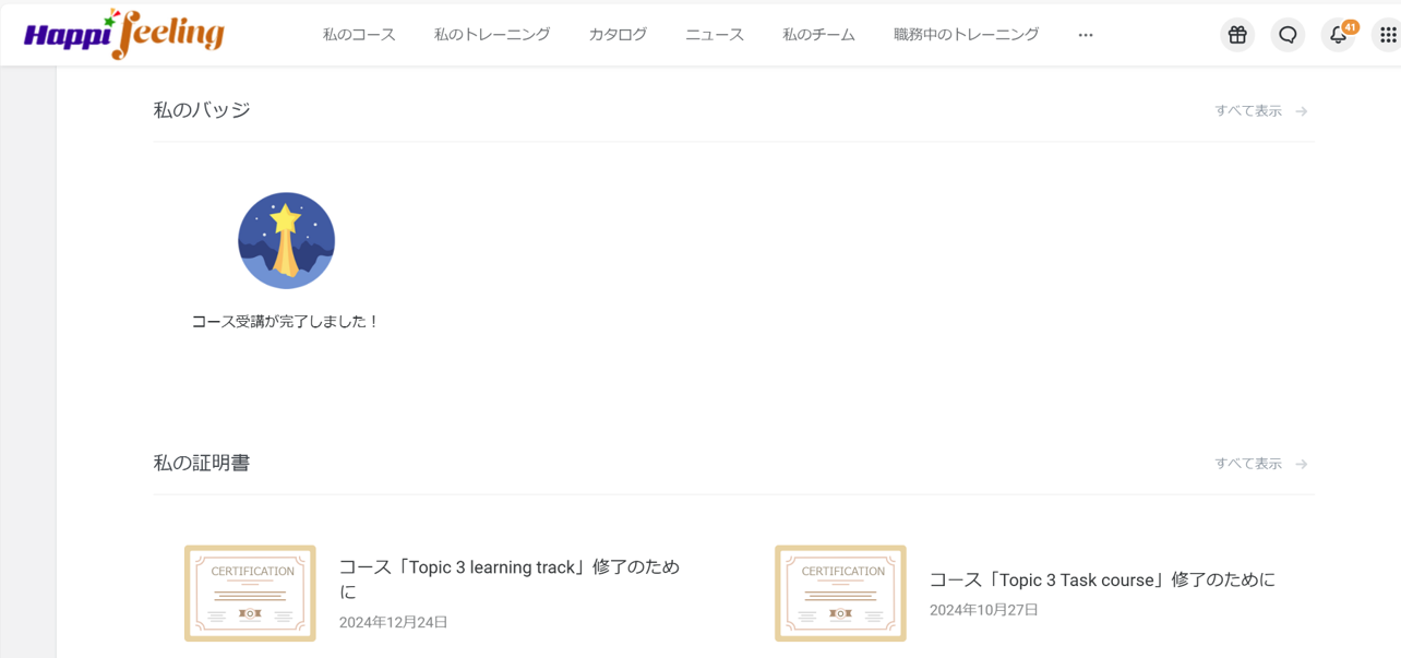 ポイント、バッジの設定を行ってランキングを行うこともできます。受講者に健全な競争心を持たせて、コンテンツ受講を促進することが可能です。バッジの種類やメッセージは変更可能です。証明書のカスタマイズ可能です!