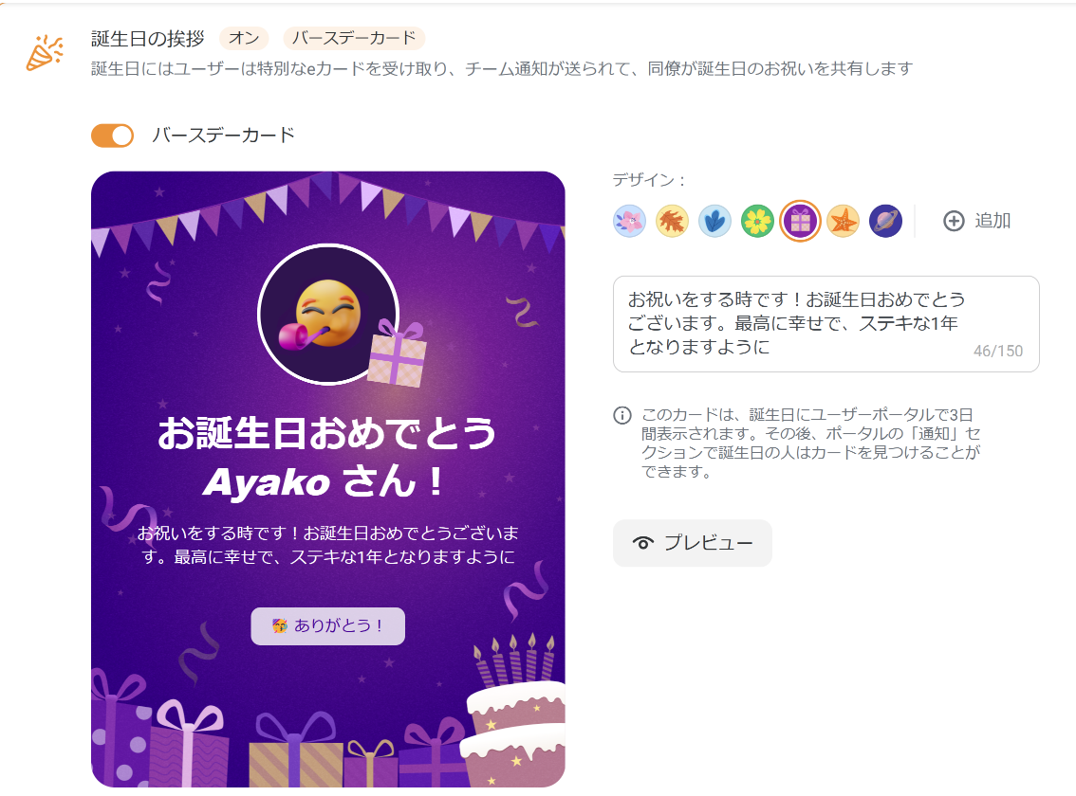月日のみで、年齢は周知されませんのでご安心を!お誕生日カードのデザイン、メッセージはカスタマイズできます。お誕生日通知は組織やチームを設定できます。