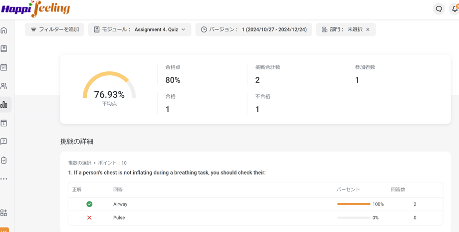 iSpring LMSは、クイズのスコアはもちろん、クイズおよびアンケートの質問ごとに回答結果を細かくレポート可能です。コンテンツに対する受講者の反応をダイレクトに伝えてくれます。スコア、アンケート結果の詳細レポートを分析することにより、コンテンツの改善を確実にすることが可能です。